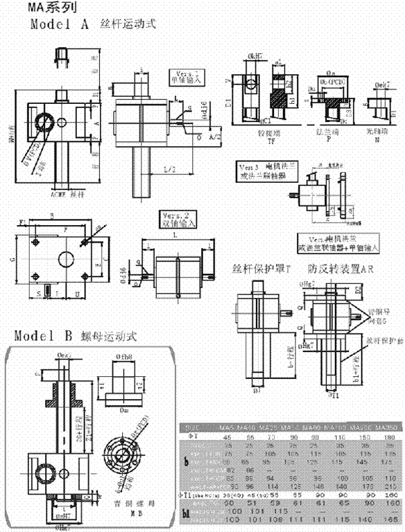 SJ螺旋升降機先進的設計,緊湊的鋁齒輪箱體,與 MA系列有更低的價格額定負載: 0.5噸 - 20噸 推桿升降速度可至30mm/s 最高輸入轉速:1500rpm 工作制:20%(10分鐘運行2分鐘)可選擇雙頭,三頭絲杠配套,參數咨詢我公司附件:齒隙抵消裝置,防轉轉置,安全螺母,防塵罩,磁感應限位開關 MA系列普通齒螺旋升降機 更適合重載應用:重負荷,高頻繁工作制 額定負載: 0.5噸 -35噸 推桿升降速度可至75mm/s 最高輸入轉速: 3000rpm 工作制:30%(10分鐘運行3分鐘)