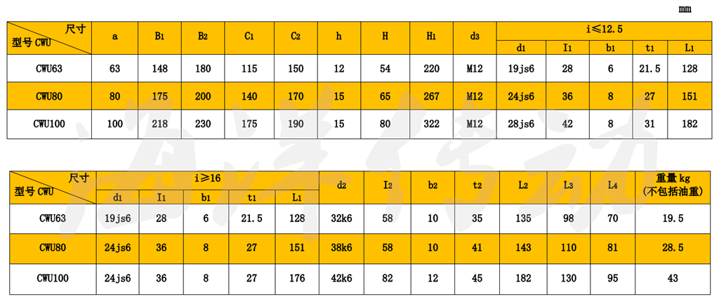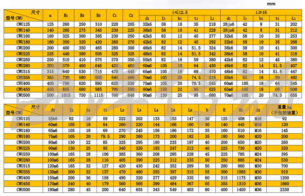 說明:海洋傳動(dòng)-CW 系列圓弧齒圓柱蝸桿減速機(jī)采用單級(jí)蝸桿減速傳動(dòng),是按照中華人民共和國國家標(biāo)準(zhǔn)(JB/7935-1999)生產(chǎn),全系列共包括三種型號(hào)CWU、CWS、CWO,16種中心距,12種減速機(jī)比。輸入功率范圍在0.39~189KW之間,輸出扭矩在107~13500N·m之間。適用于冶金、礦山、運(yùn)輸、水泥、建筑、化工、紡織、輕工、能源、環(huán)境等行業(yè)的機(jī)械傳動(dòng)。
